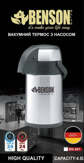 Термос помповий Benson BN-287, 4 літри, з неіржавкої сталі з пневмонасосом і ручкою для перенесення